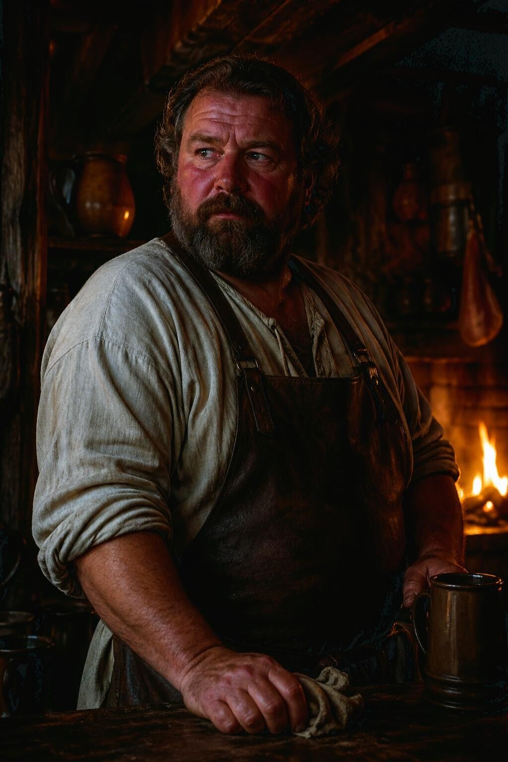 Hij is geen man van grote woorden. Hij luistert liever dan hij spreekt en weet precies welke gasten gevaarlijk, wanhopig of te nieuwsgierig zijn. De oude verhalenverteller kent hij al langer, en hij weet dat diens verhalen soms meer waarheid bevatten dan goed is voor de mensen die luisteren.