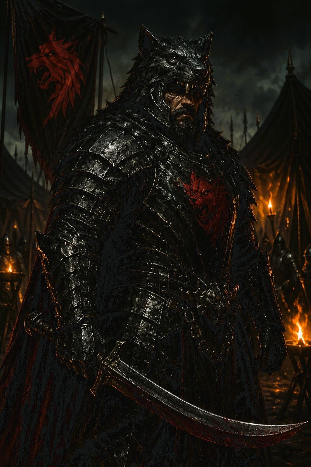 De krijgsheer van de Bloedrode Wolf is een beruchte huurlingenleider van 45 jaar. Zijn echte naam is nauwelijks nog bekend; de meeste mensen kennen hem alleen aan zijn banier en zijn zwarte pantser. Hij is groot, zwaar gebouwd en draagt een helm in de vorm van een wolvenkop. In de strijd gebruikt hij een kromzwaard, waarmee hij snel en hard toeslaat.