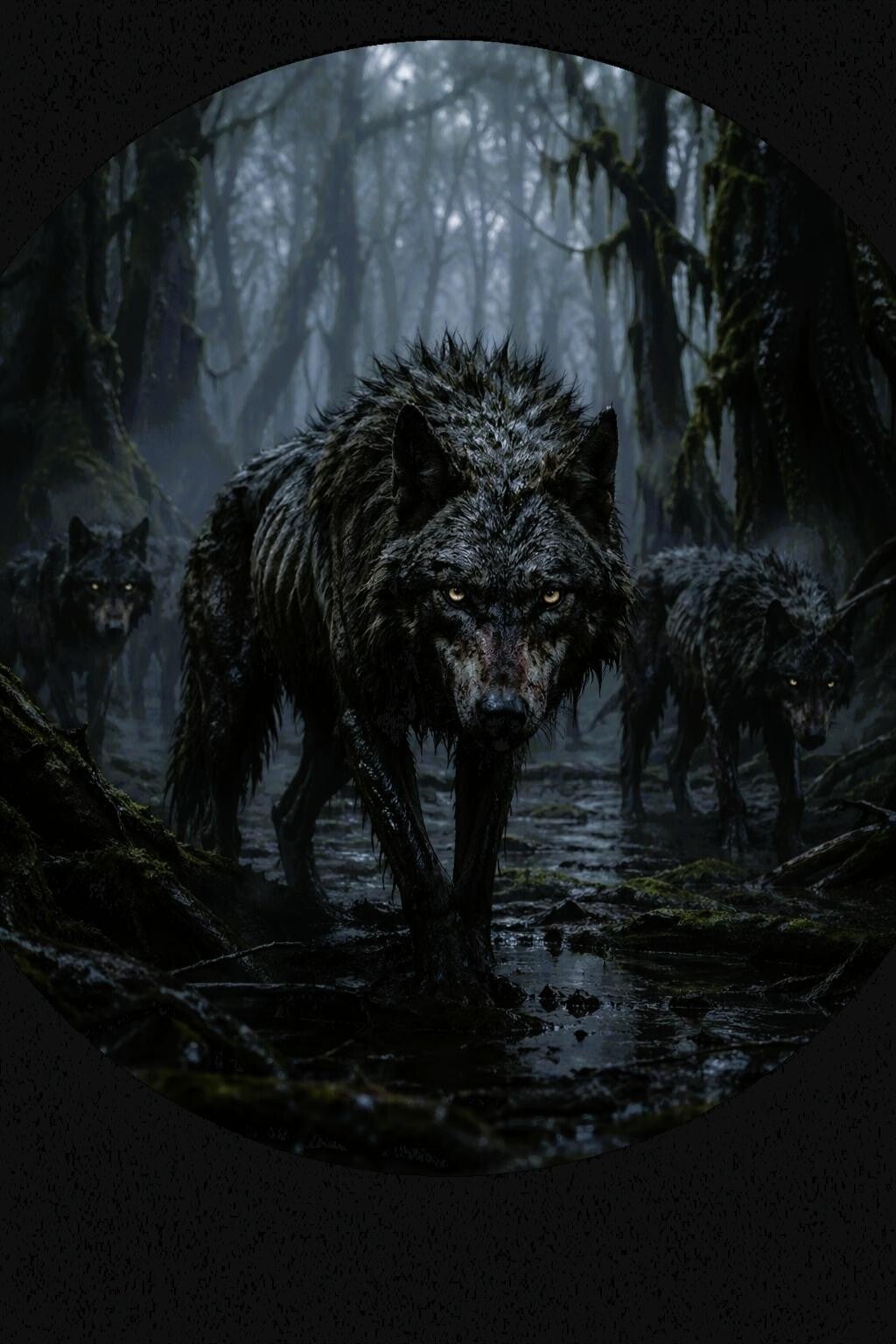 De wolven van het Drenkende Woud zijn geen magische monsters, maar uitgehongerde roofdieren die door een harde winter en gebrek aan wild gevaarlijk zijn geworden. Ze leven diep tussen de natte wortels, mistige boomstammen en drassige paden van het woud. Hun vachten zijn grauw en vuil, hun ribben zichtbaar onder de huid, en hun ogen lichten fel op in het schemerige groen.