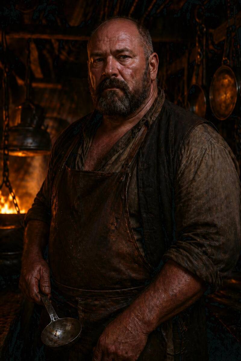 Mels Ketelhaak is de scheepskok van De Bloedmaan, maar wie hem alleen als kok ziet, maakt een gevaarlijke vergissing. Hij is een forse man van zevenenveertig met dikke armen, brede handen en een gezicht dat zelden iets verraadt. Zijn hoofd is kalend, zijn kaak zwaar, en zijn kleding ruikt bijna altijd naar rook, pek, vis en stoofpot. In de kombuis beweegt hij met rustige zekerheid, alsof messen, vuur en kokend water verlengstukken van hem zijn.