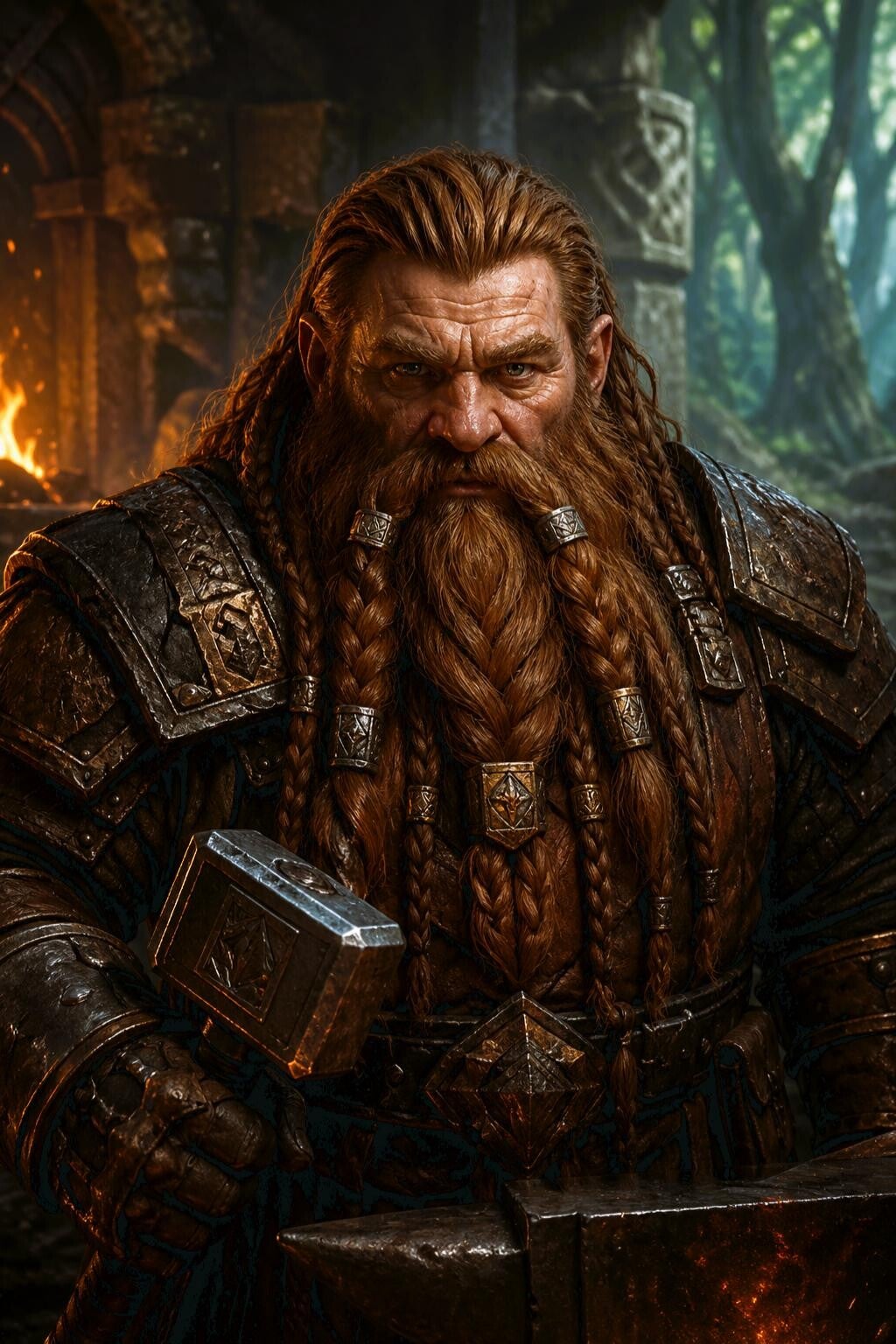 Borin IJzerbaard is een dwergkrijger en smid-meester van 148 jaar. Hij is breed gebouwd, laag bij de grond en sterk als een muur van graniet. Zijn lange koperbruine baard is gevlochten met ijzeren ringen waarin de tekens van zijn familie staan gegraveerd. Borin draagt een zwaar harnas dat al generaties meegaat en zichtbaar is hersteld op plekken waar het ooit door bijlen, klauwen en vuur werd beschadigd.