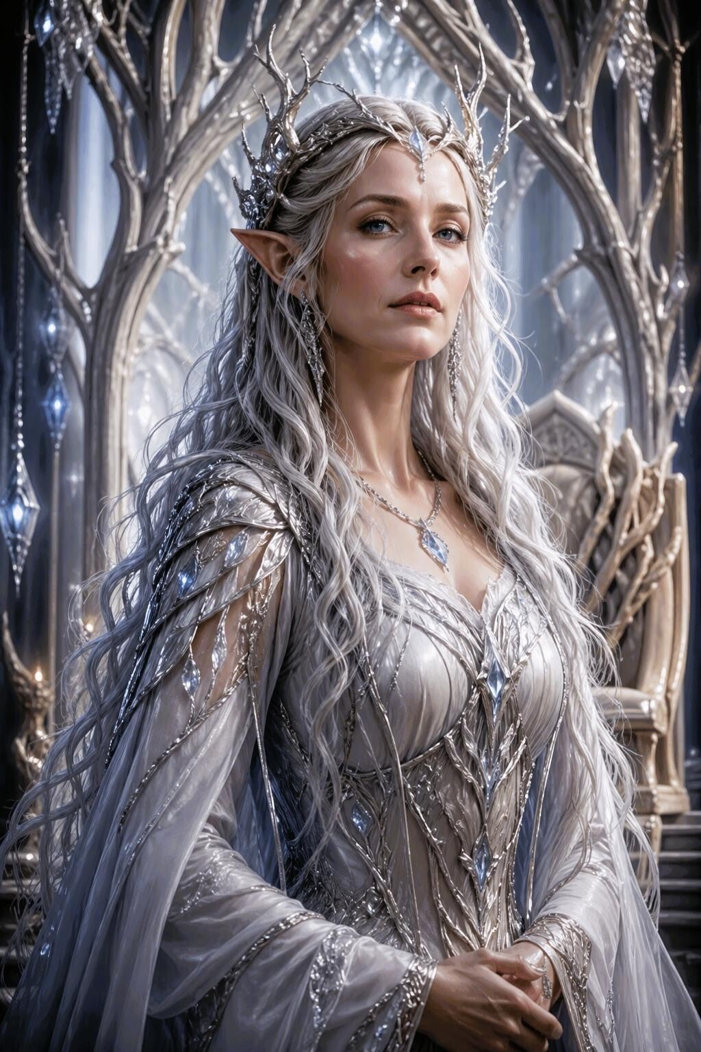 De elfenkoningin is de heerseres van het verborgen elfenhof en de hoedster van het oude woud. Haar leeftijd wordt zelden uitgesproken, maar men zegt dat zij al bijna negen eeuwen over het rijk waakt. Ze heeft een tijdloze uitstraling, met ogen waarin verdriet, wijsheid en hoop tegelijk wonen. Haar gewaden glinsteren als ochtenddauw en haar troon van levend hout lijkt met haar mee te ademen.