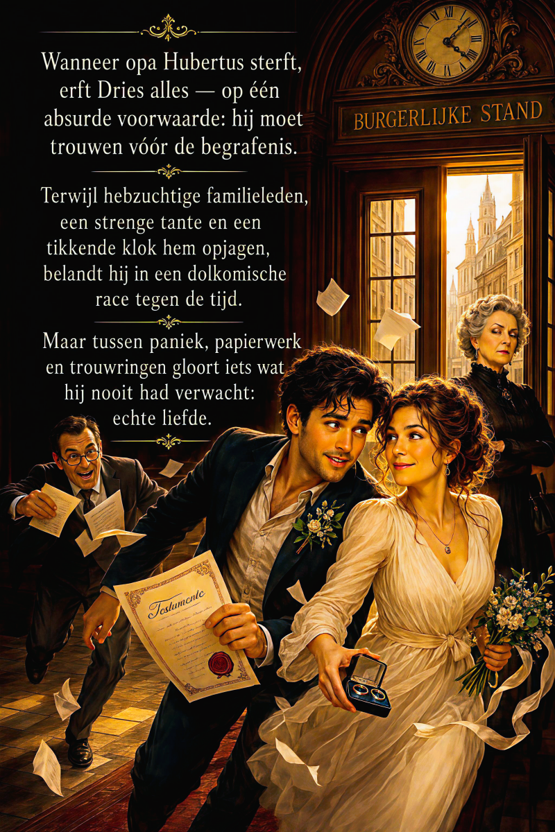 Wanneer opa Hubertus sterft, laat hij zijn kleinzoon Dries een gigantische erfenis na — maar met één absurde voorwaarde: hij moet trouwen vóór de begrafenis. Wat volgt is een dolkomische race tegen de klok vol opdringerige familieleden, mislukte bruiden, papierwerk, dorpsroddels en een tante die allesbehalve tevreden is. Tussen paniek, trouwringen en oude familiegeheimen ontdekt Dries dat liefde soms verschijnt op het meest onmogelijke moment.