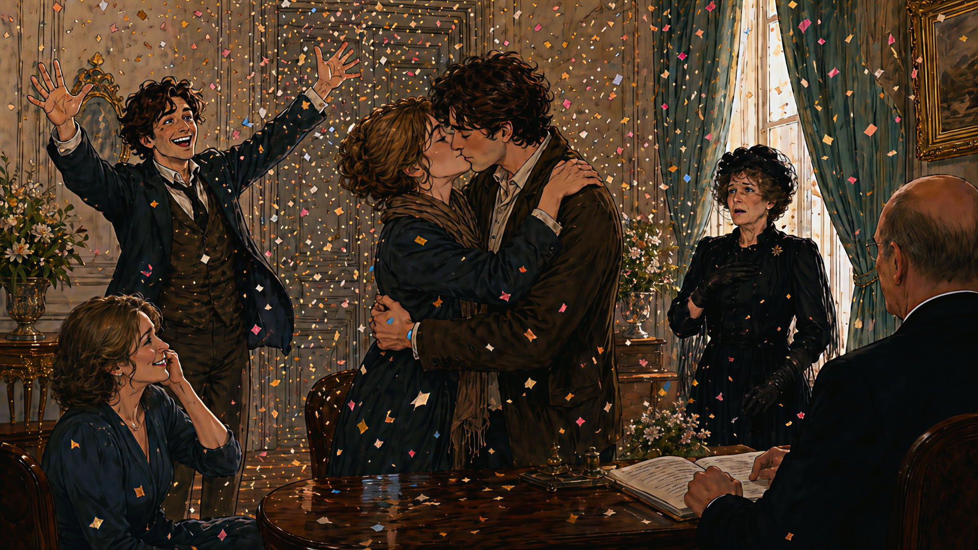 Een uur later zat de familie in de salon alsof er een veiling begon. De koffie was koud, de gordijnen halfgesloten en de opgezette fazant keek toe vanuit de gang.