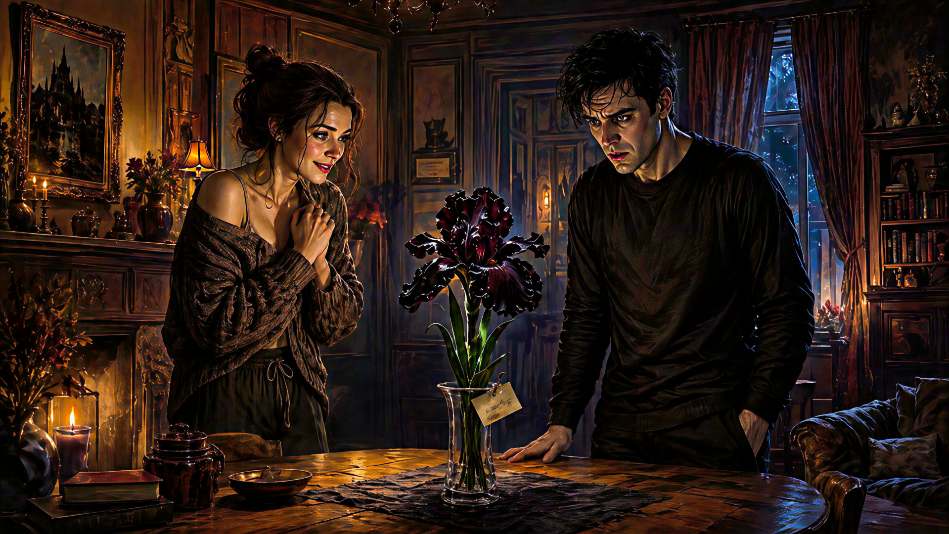 Jens lachte, gaf haar een kus op haar voorhoofd en zette de vaas precies in het midden van de tafel. Daar viel het laatste avondlicht op de donkere bloemblaadjes. Even leek de bloem dieper rood te worden, bijna levend.
